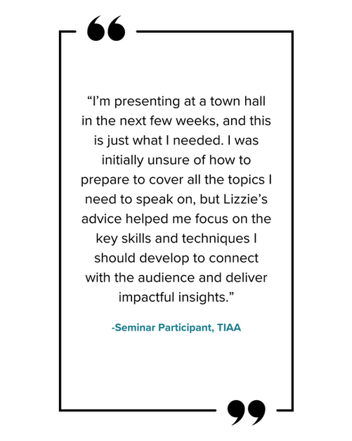 Lizzie is a Chicago-based TEDx speaker and public speaking/ presentation coach. With a diverse background in acting, improvisation, sales enablement (Google), speech therapy (NYU/Northwestern), and marketing (Miami of Ohio), she has analyzed the elements of effective public speaking and developed strategies to prepare for success.